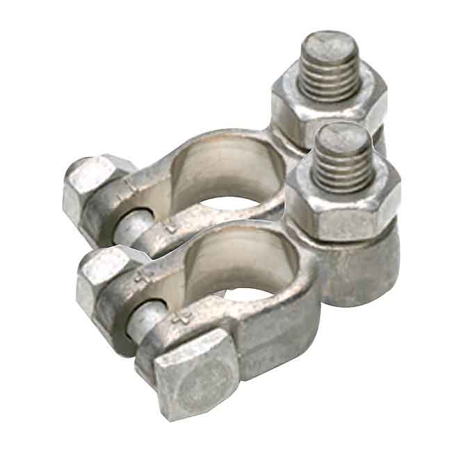 Förtennad batteripolsko i mässing med gänga och mutter. Set med 2 st. (plus och minus)