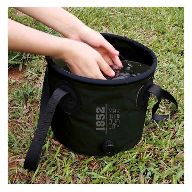 Vattenkran i hinkens nederkant för utomhusdusch: fyll på vatten, häng upp, öppna kranen och du har en dusch. Hinkens kant har en plastring som håller upp öppningen. Med bärremmar för enkel transport.