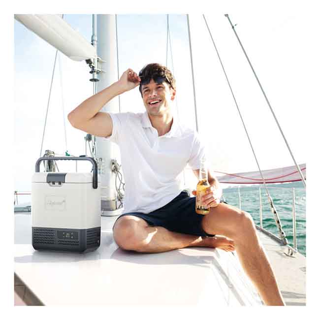 Kompressorkylbox till batteri, 12/24V DC - 4/2 Amp - 45W. En riktigt trevlig kylbox som man lätt kan ha med sig, kall dricka i båten, på stranden eller ute i trädgården, utan att behöva bära med sig en 50l-box.