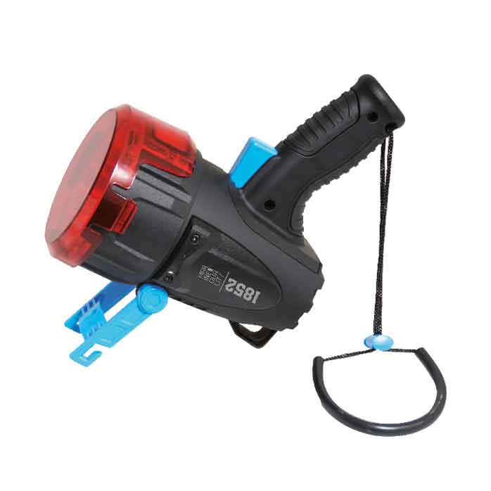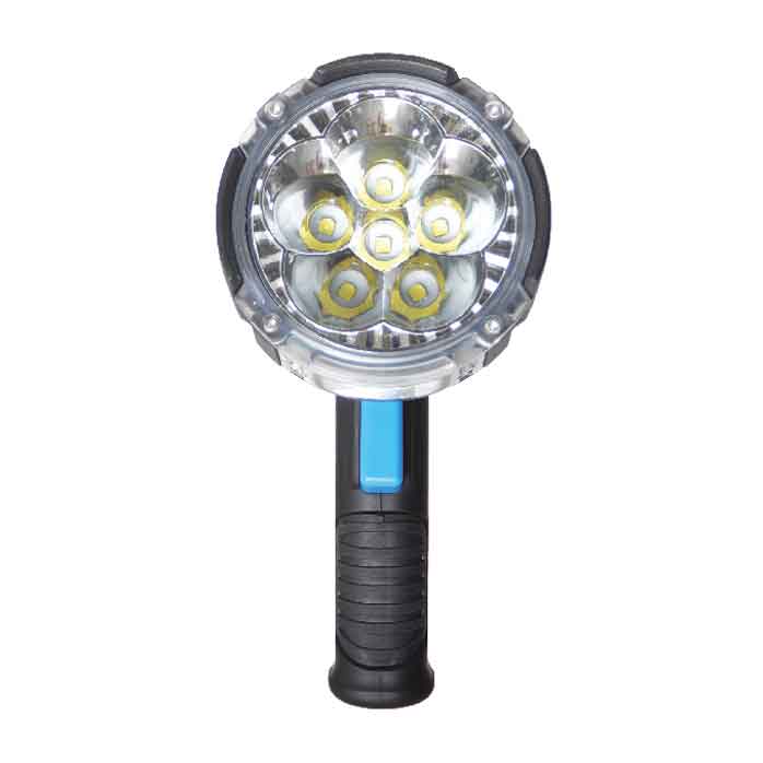 Här har du en kraftfull LED-spotlight med hela 10 000 lumen. LED-strålkastaren har en stark och robust konstruktion, hållbar för tuff användning i den marina miljön. Med 6 kraftfulla USA Cree® XHP50.2 lysdioder/110 watt. När du håller lampan i handen känner du direkt kvaliteten och när den slås på ser du den kraftfulla ljuskäglan. På undersidan av huvud-reflektorn finns en mindre 6W LED lampa för närbelysning, arbetsljus eller som lykta.