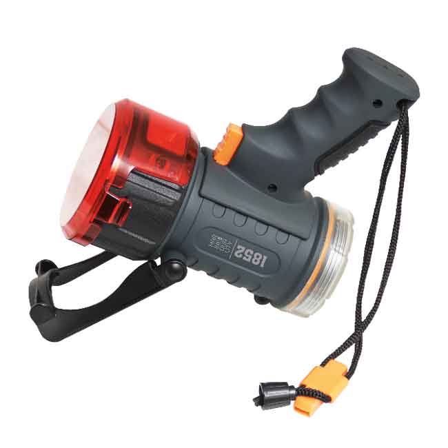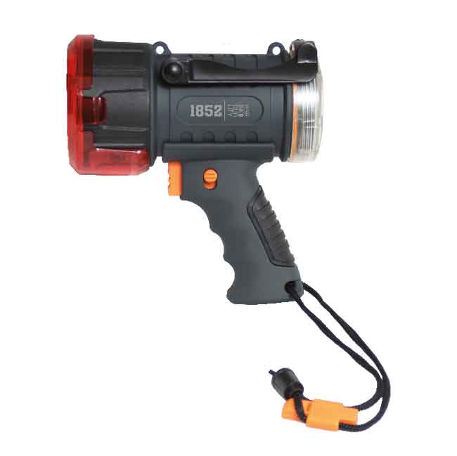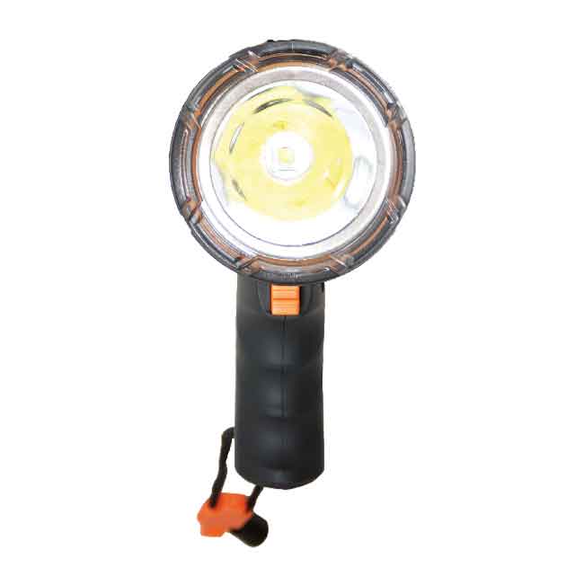 Med ett kraftigt robust hölje är denna 2000 lumen LED-spotlight tillräckligt hållbar för användning i den marina miljön. Konstruktion står väl emot stötar och vibrationer, och det räfflade och greppvänliga handtaget har en avtryckare som gör den intuitiv och enkel att använda. Två effektinställningar, hög och låg. 400m ljuskägla. På undersidan av huvud-reflektorn finns en mindre 6W LED lampa för arbetsljus eller som lykta.
