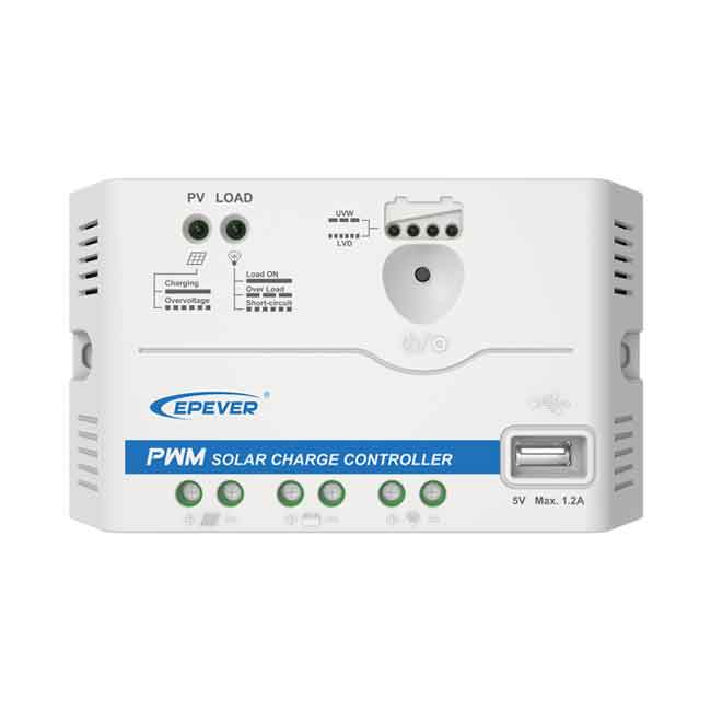 En PWM solcellsregulator på 10 A/20 A medföljer för laddning av 12V-batteriet. Panelen har även direkta USB-utgångar för laddning av mobiltelefoner mm.