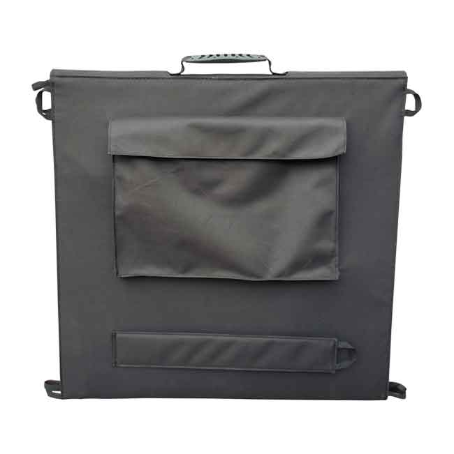 Panelen kan läggas plant, eller ställas upp i vinkel med de integrerade benen. En serie remmar gör det enkelt att fästa panelen.