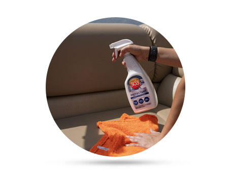 2: Spraya 303 Marine Aerospace Protectant direkt på ytan eller på en mikrofiberduk och applicera sedan på ytan (Ej i direkt solljus).