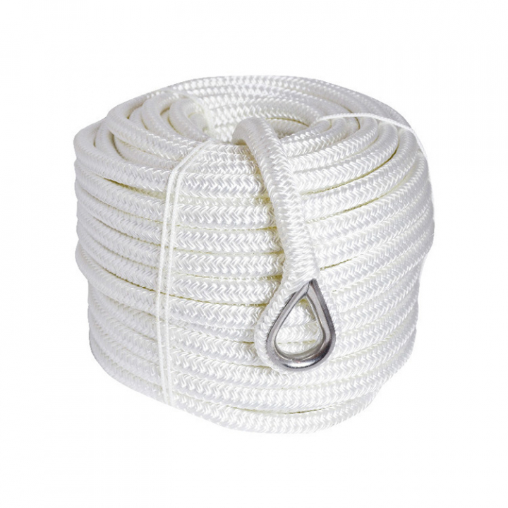 Vit ankarlina av polyester med flätat hölje från 1852 Marine Quality, har bra elastiska egenskaper och är väldigt bekväm att dra i. Kommer levererad med en insplitsad rostfri kaus.