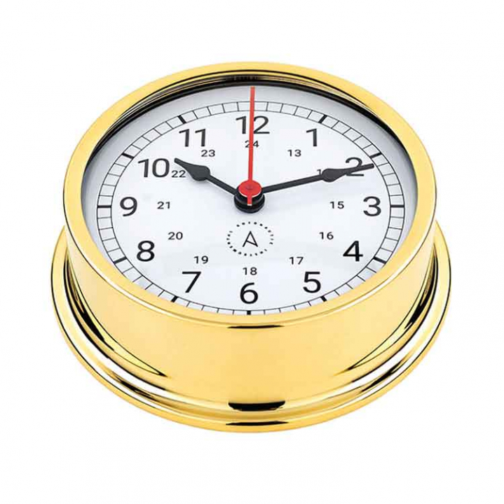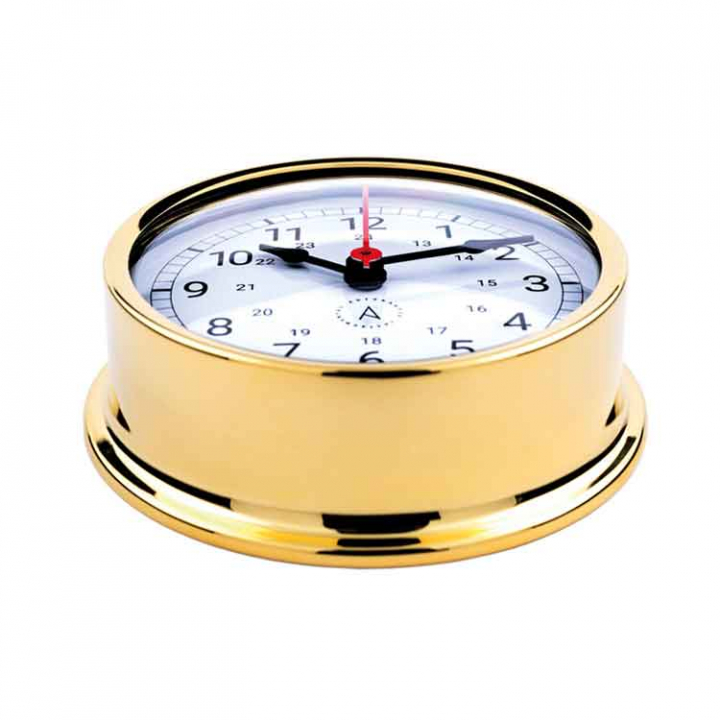 Autonautic skeppsur R120D-A är ett stilfullt nautiskt ur i förgylld mässing, perfekt för fritidsbåtar och mindre kommersiella fartyg. Det kombinerar klassisk maritim design med modern funktionalitet och har ett praktiskt Easy Fix System som gör installation och underhåll enkelt. Ett elegant val för både båtar, husvagnar och husbilar.