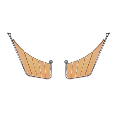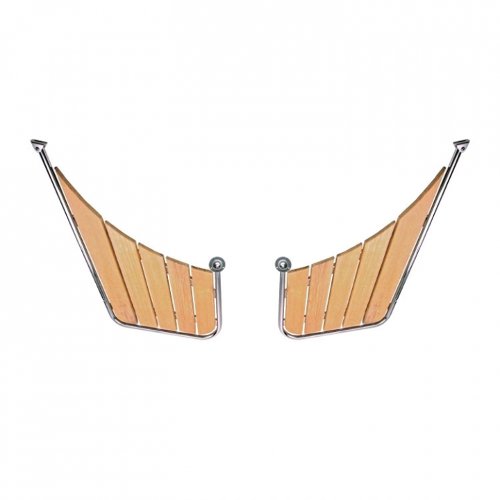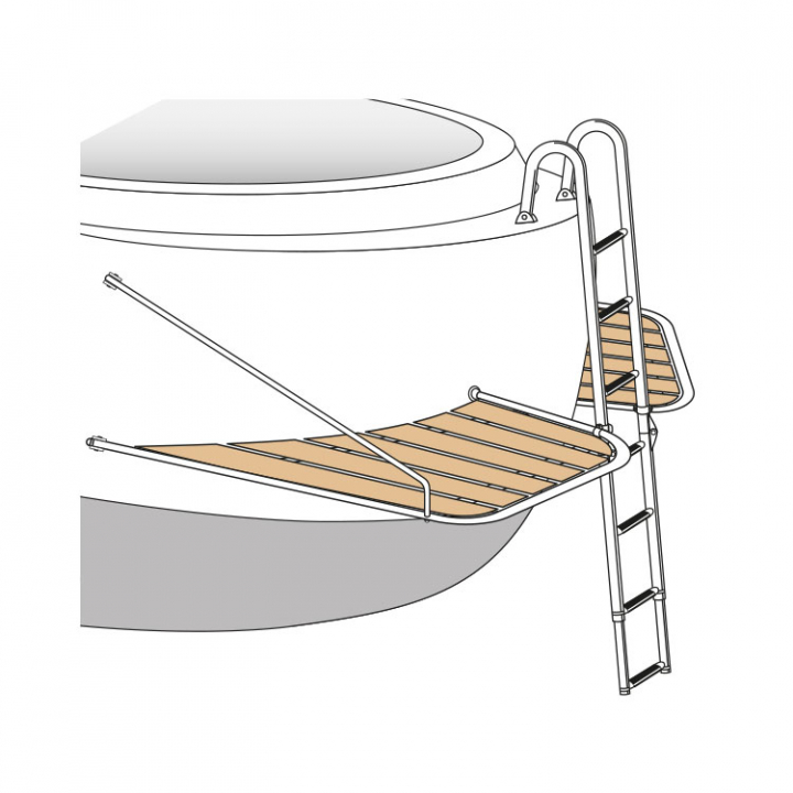 2-delad stävplattform i AISI 316 rostfritt stål med kvalitetsteak passar spetsiga akterpartier, t.ex. Nordisk Snekke. Alla plattformar har universalbeslag som passar de flesta båtar.