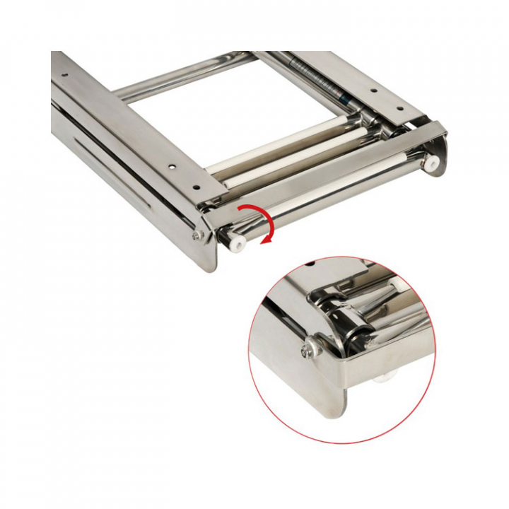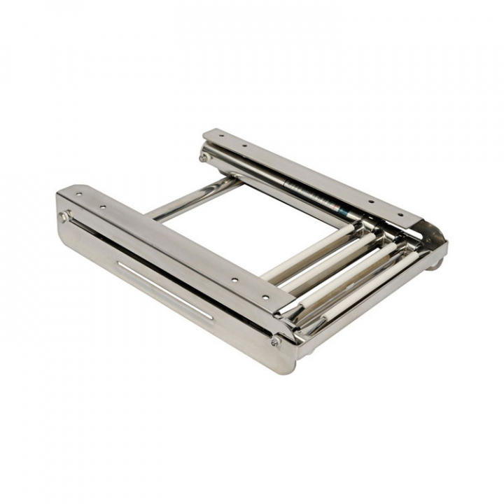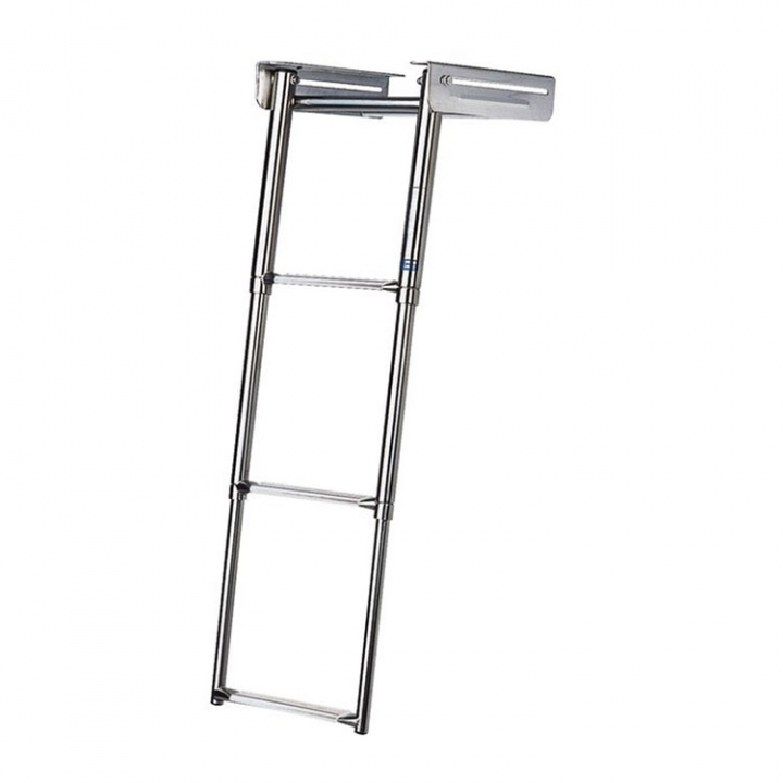 Teleskopstegar i kasett, monteras under badplattform. Tillverkad av rostfritt stål och ovala steg med halkfri vit plastbeläggning. Teleskopstegen kan fällas in i kassetten som är utrustad med ett fallsäkert frontlås.
