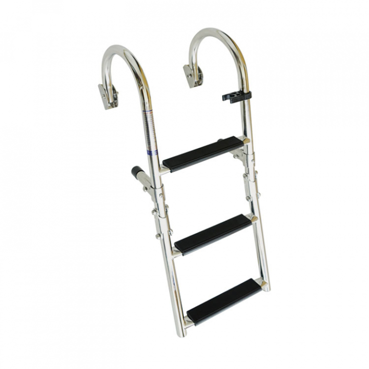 Badstegar i polerat rostfritt stål. Monteringsfästena är gångjärnsförsedda för att matcha båtens vinkel. Den höga bågen fungerar bra som handtag och gör det lättare att klättra upp.