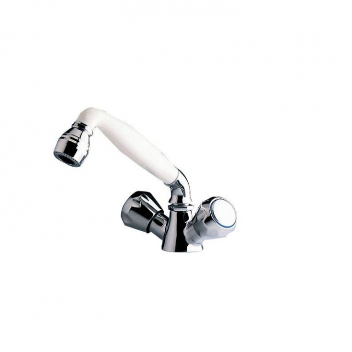 Kraftig kromad blandare med metallhandtag och utdragbar plastdusch med justerbar vattenstråle.