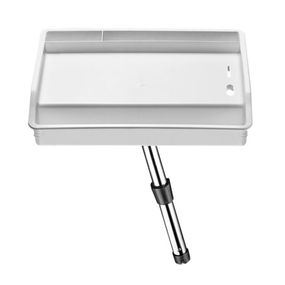 Bord för montering i fiskespöhållare med hög kant. Benet fälls upp under bordsskivan.