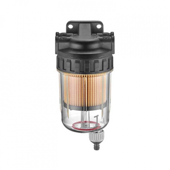 10 micron bensinfilter med aluminiumtopp, klart glas så att man enkelt kan se om det finns vatten eller smuts i bränslet och utbytbar filterinsats. Levereras med slangstosar. 3/8" gänga till 10 mm slang. - Egenskaper