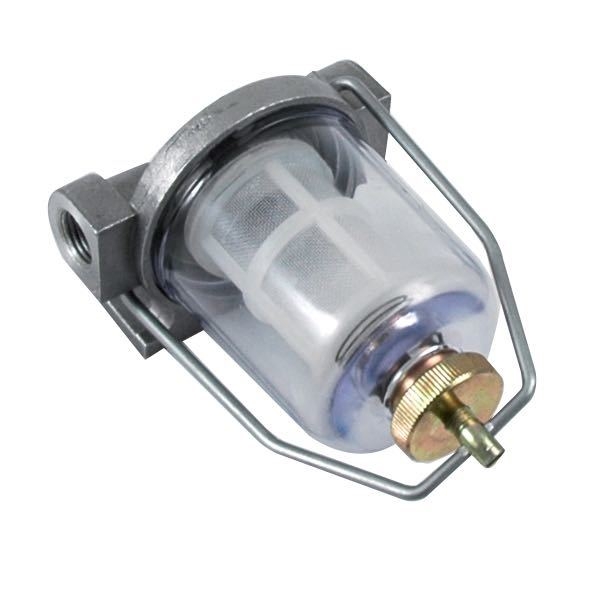 Bränslefilter för båtar, komplett med filter, glas och monteringsfästen. Universalfilter av aluminium och glas. Fläns för montering och utbytbar filterinsats.