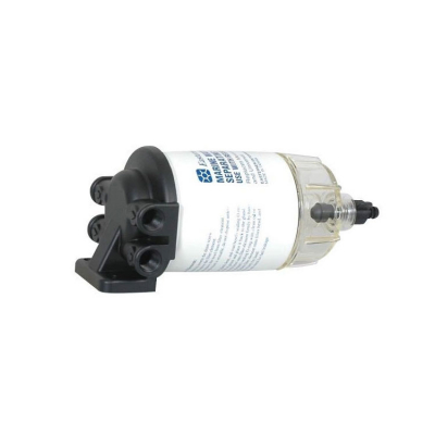 Solitt bränslefilter med aluminiumöverdel, "twist-on"-filter och vattenavskiljare i aluminium att skruva fast i botten av filtret.