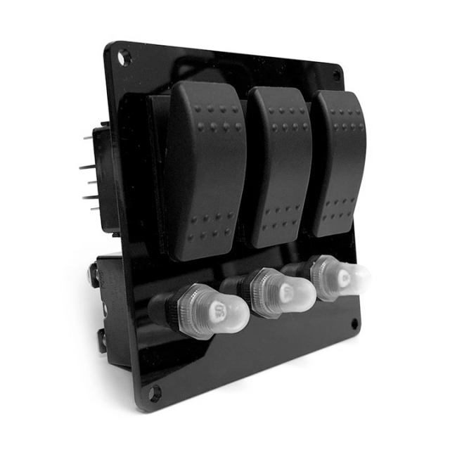 Panel i 3mm stöpt svart akryl för tre brytare och automatsäkringar.