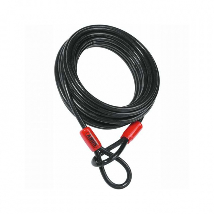 ABUS låsvajer är belagd med svart PVC för att undvika skador på vajern. Det finns en ögla i vardera änden av vajern där hänglåset kan fästas.