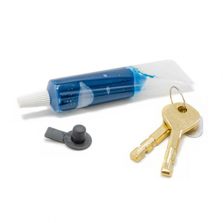 Låset finns i fyra olika varianter beroende på akterspegelns tjocklek. Medföljande hylsa med säkerhetsbricka används för enkel montering av lås.