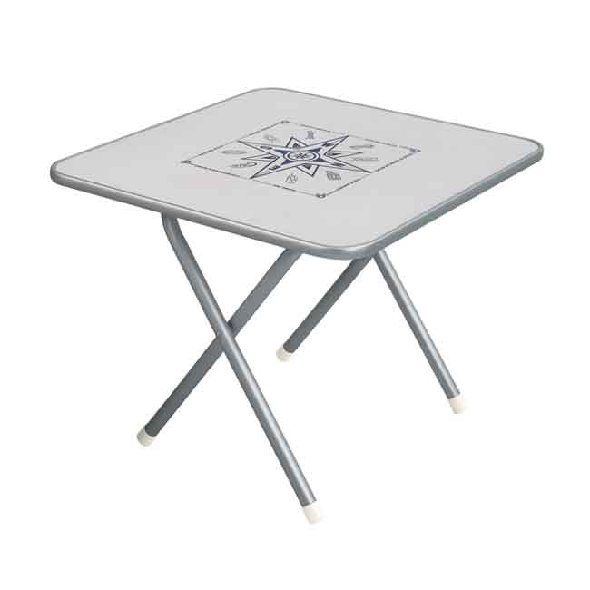 Ihopfällbart Aluminiumbord med bordstopp i fuktbeständig MDF.