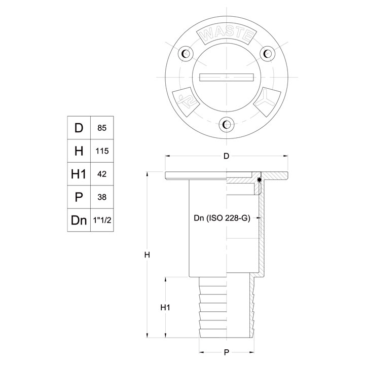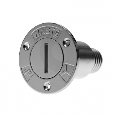 Däcksförskruvning "WASTE" för tömning av septiktanken. Däcksanslutningen följer ISO 8099:2000 standarden.