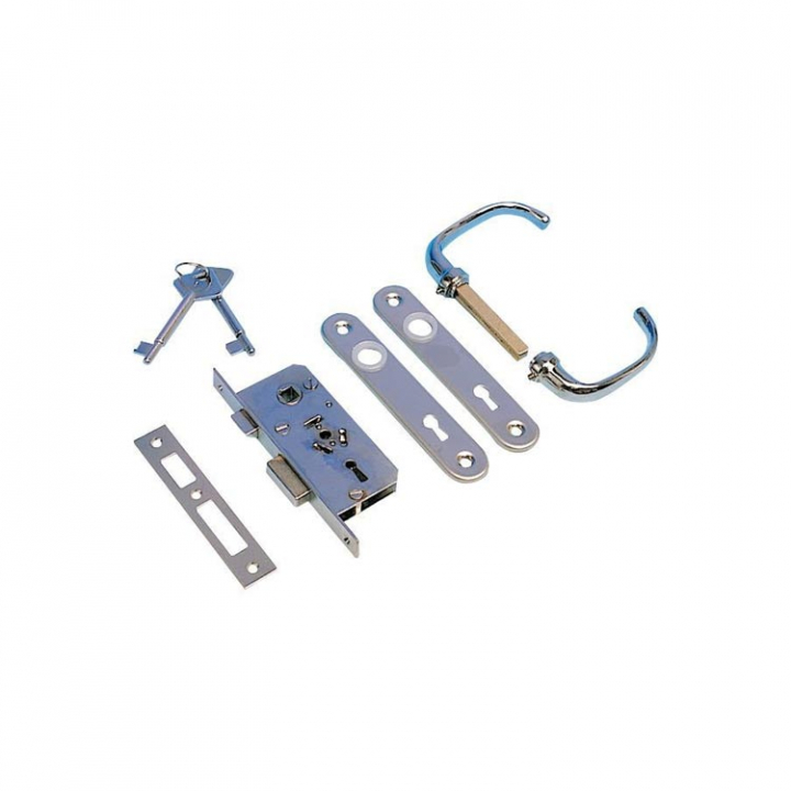 Dörrlås för inbyggnad. Låskista med 2 nycklar, 2 dörrskyltar och vred.