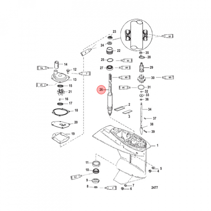 Drivaxel (Driveshaft 822159T1) Lång. Givetvis passar denna inte alla långriggade utombordare utan du måste titta på ditt motornummer i Mercurys epc för att säkerställa att detta är rätt drivaxel för just din motor.