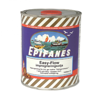 Epifanes Easy Flow impregneringsolja, används som skydd och impregnering på obehandlat trä. Oljan är djuppenetrerande och mättar träet. Stryk Easy Flow vått i vått tills träet är mättat, torka av överflödig olja. Låt verka minst 2 veckor beroende på temperatur innan lackning eller målning påbörjas.