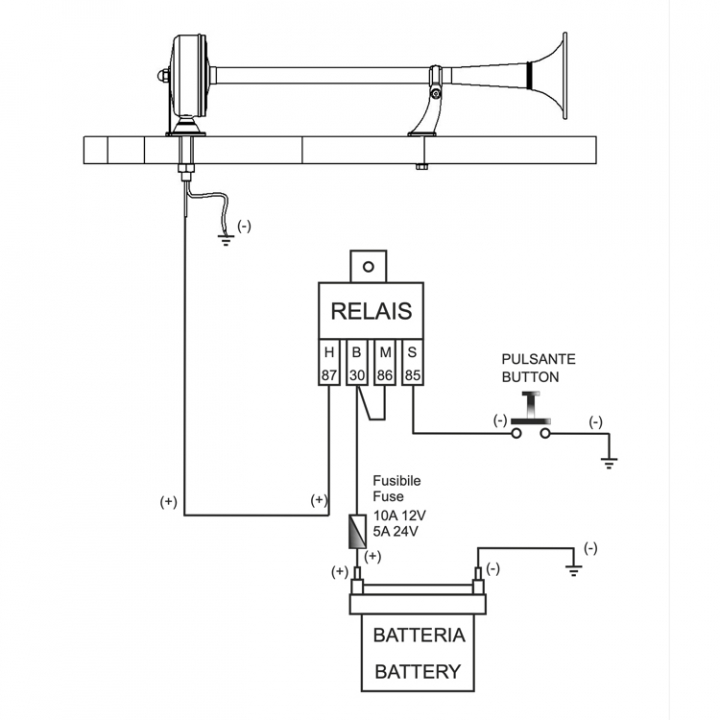 Marco EMX1/2 är ett rostfritt elektromagnet signalhorn. Strömkabeln är integrerad i fästet och blir dold vid montering för en snyggare installation. Hornet är 470 mm långt och levererar 105dB vid en meters avstånd på frekvensen 340Hz.