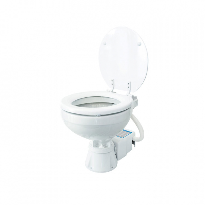 Toalett med elektrisk tömning. I botten på denna toalett sitter en elektrisk pump med en inbyggd avfallskvarn som mal sönder avfall och papper. Utloppet på 25 mm kopplas förslagsvis till någon av våra septiktankar. Till inloppet för spolvatten monteras en 3/8" rörstump samt en slang med innerdiametern 15-16 mm.