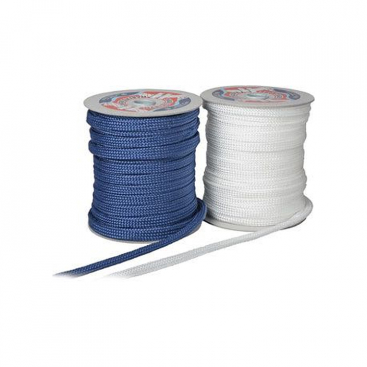 32 cordel hålflätat polypropylenrep i vitt eller marinblått. Extremt mjukt, platt tågvirke tillverkat speciellt till fender.