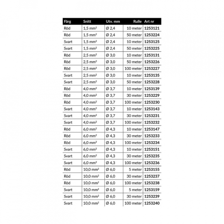 • Kablarna är tryckta med specifikationen på isoleringen - Egenskaper