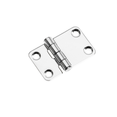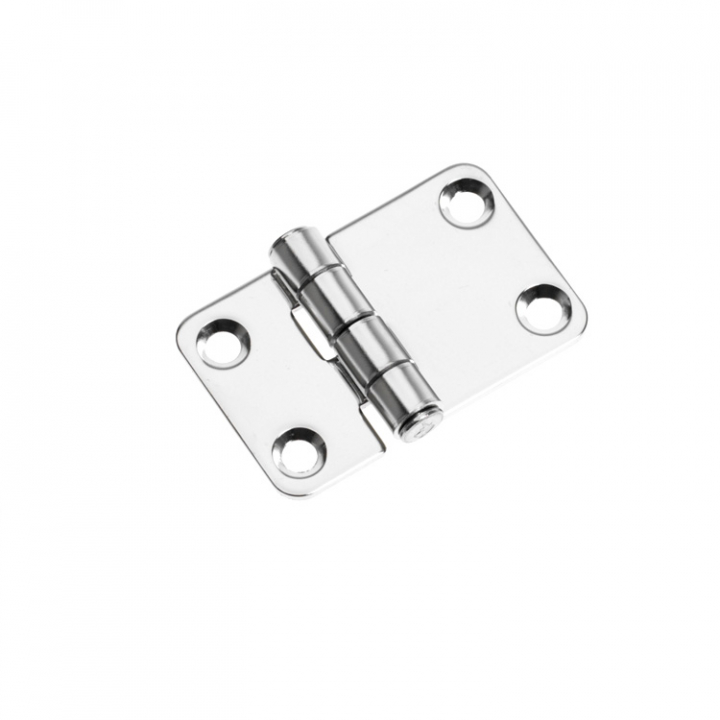 Ett litet smidigt luckgångjärn i elektropolerat rostfritt stål, med storleken 37x59 mm. Gångjärnet har försänkta skruvhål. - Egenskaper