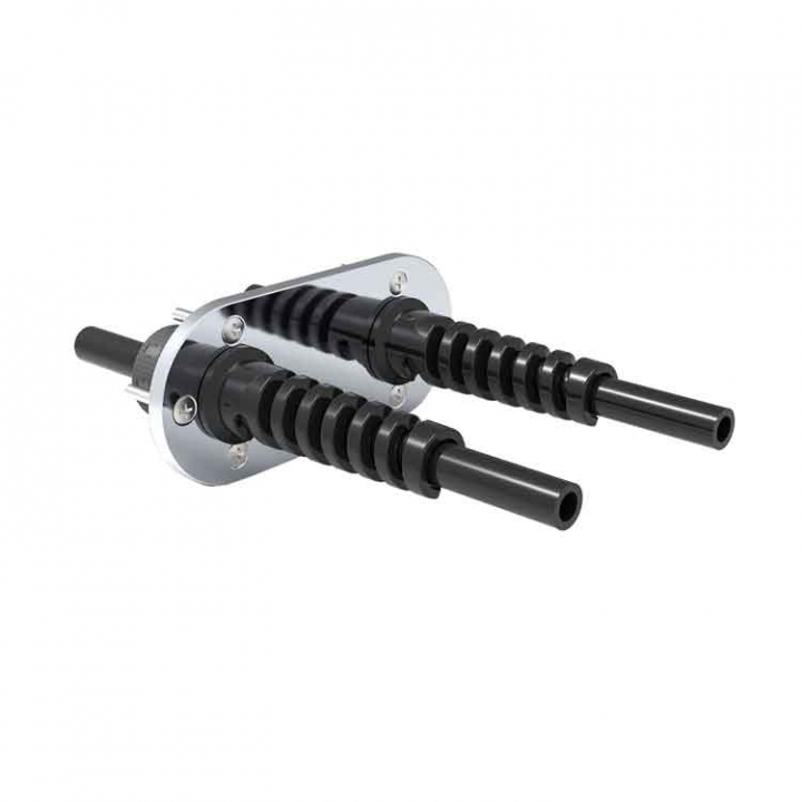 Seastar genomföring i UV-beständig plast med rostfri täckkåpa som kan eftermonteras på två Seastar hydraulslangar med pressade kopplingar, skapar en snygg montering.
