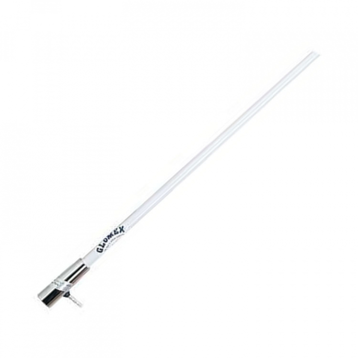 Kraftig vhf-antenn i glasfiber till motorbåt. Antennen har kromad mässingssockel, 4,5 meter kabel medföljer antennen.