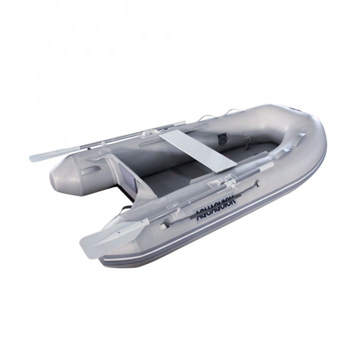 Aquaquick gummibåt med trätoft på glidskena så att sätet kan justeras fram och tillbaka. Färgen är ljusgrå med mellangrå fenderlister. Båten har goda köregenskaper, trädurk i vattenbeständig plywood med P.U.-färg och V-botten med uppblåsbar köl. Levereras med bärväska, reparationssats, fotpump och åra.