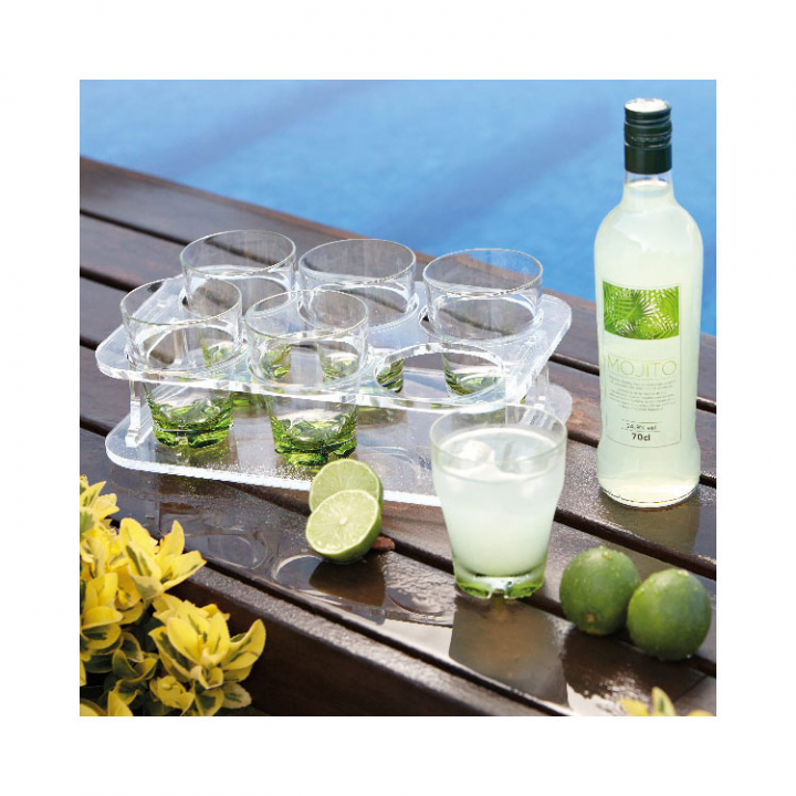 Hopfällbar glashållare i akryl för glas, utrustad med glidskydd i botten.