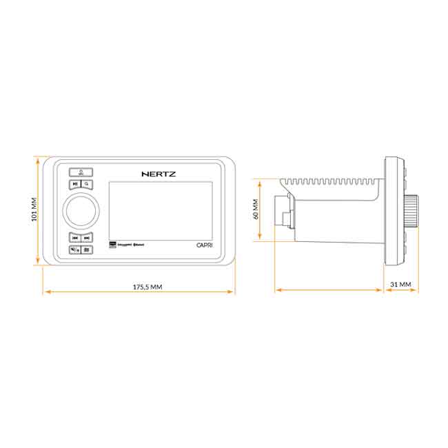 Capri H100 från Hertz är en avancerad marinradio i elegant italiensk design. Radion levererar upp till 24-bits ljudupplösning och kan kopplas in via både trådlösa och trådbundna anslutningar. En 4,3-tums färgskärm visar vad som spelas.