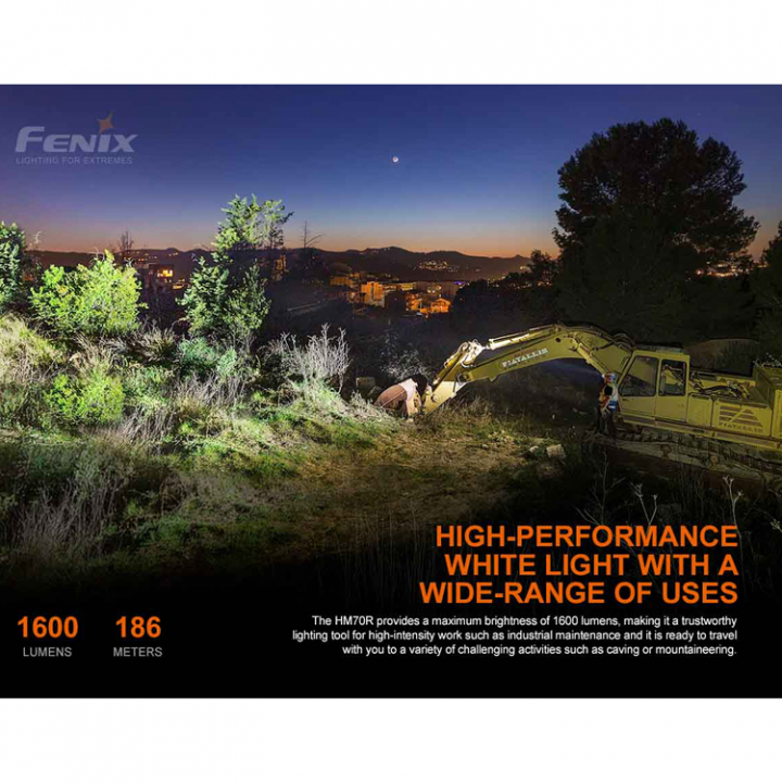 Den dolda USB C-porten gör pannlampan damm- och vattentät, med IP68-klassning, samt möjliggör snabbladdning på 2A ström. Batterinivåindikator, ett intelligent minne och låsfunktion kompletterar funktionerna på Fenix HM70R.