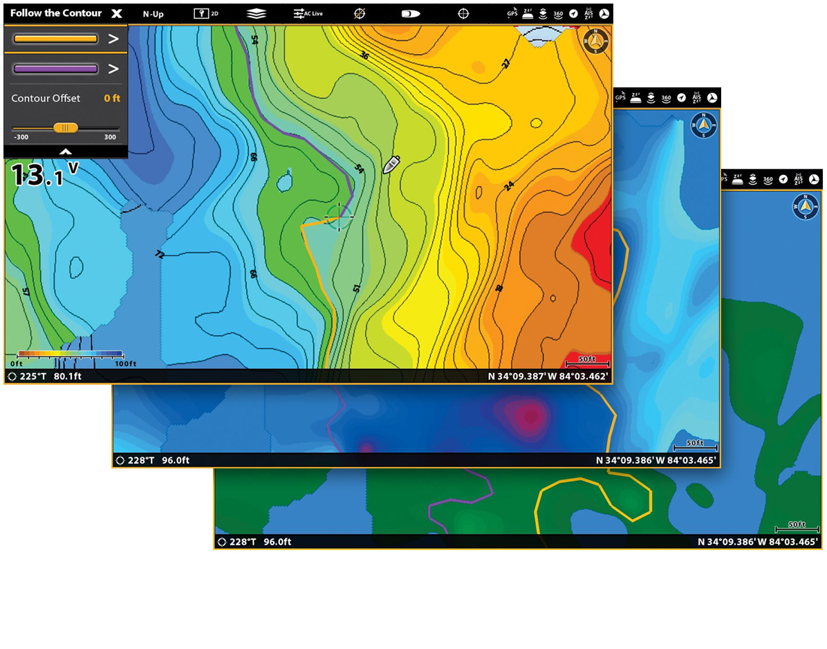Välj mellan eller kombinera Humminbird LakeMaster, AutoChart Live och Navionics. Med Lakemaster och AutoChart Live kan du få din One-Boat Network kompatibla elmotor från Minn Kota att automatisk följa djupkurvor och strandlinjer.