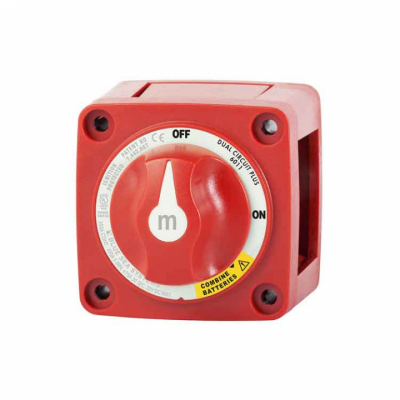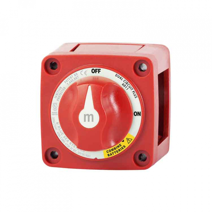 Mini Dual Circuit Plus Huvudströmbrytare från Blue Sea Systems, en 3 i 1 brytare för enkelt bryta anslutningen till två batterigrupper samtidigt eller sammankoppla grupperna i ett tredje läge.