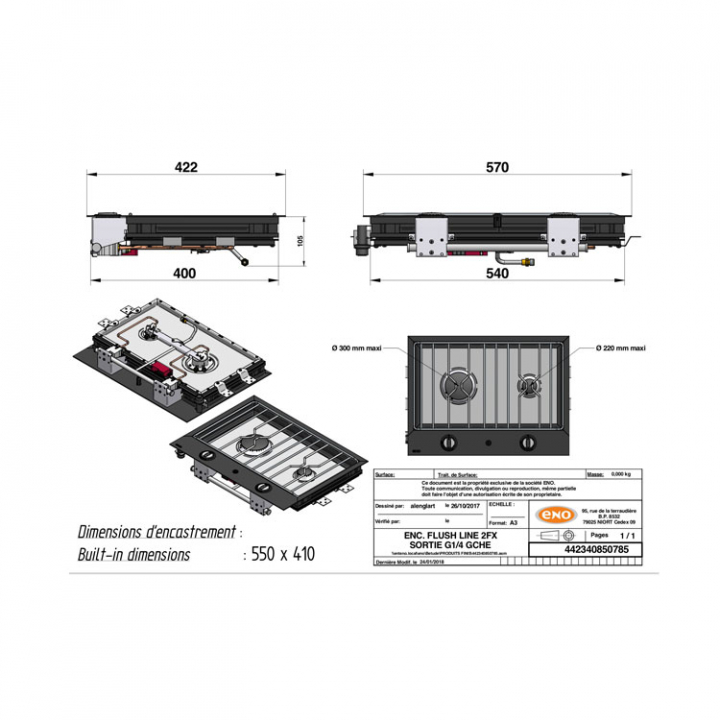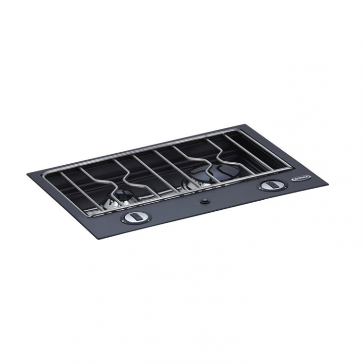 Inbyggnadshäll i aluminiumram och pressad rostfri plåt för nedfälld montering i pentrybänk. Med nya Sabaf brännare som förbrukar 20% mindre gasol. Monteras i samma nivå som bänken, flushmontering. Två brännare 1st 1000W & 1 2200W. Eltändning