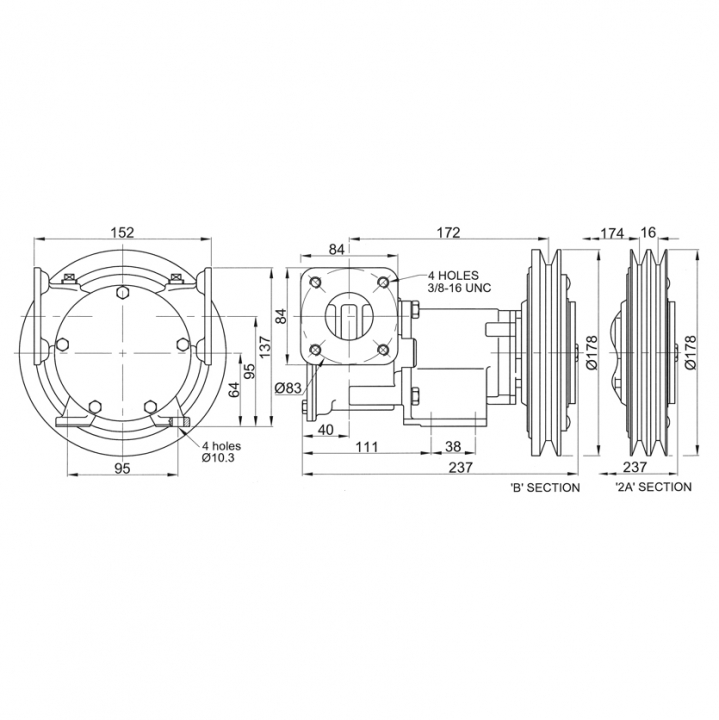 Jabsco självsugande impellerpump i brons med elektrisk magnetkoppling av remskiva. Aktiveras genom strömbrytare (tillval) som kan placeras på lämplig plats.
