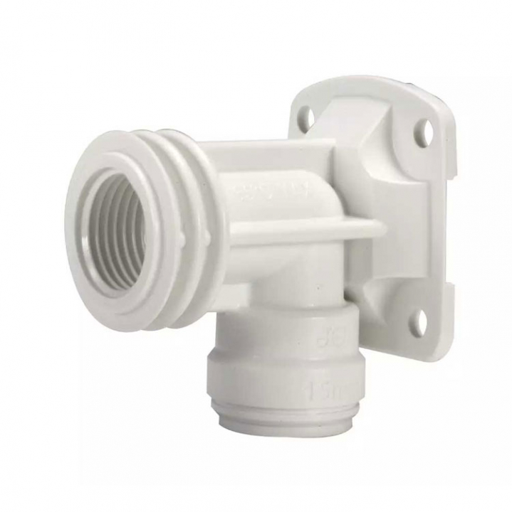 90° skott-vinklad 15mm koppling med twist and lock för John Guest snabbkopplingssystem till 1/2″ BSP gänga. Lämplig för inkoppling av kran eller annan enhet som använder BSP-gänga.
