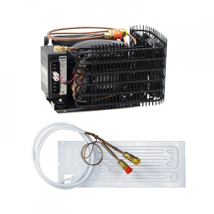 Kylaggregat för dig som vill skapa en inbyggd kyl i båten. Systemet är luftkylt med luft som blåses genom kondensatorn med hjälp av en fläkt. Det är det traditionella sättet att ta bort värme.