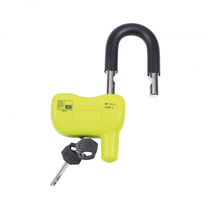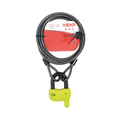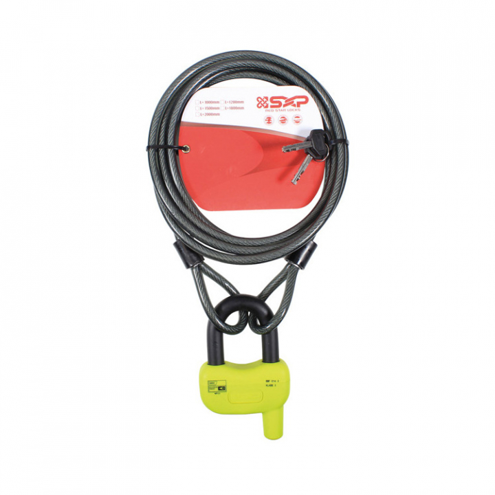 Levereras komplett med ett stort och rejält bygellås i en väl synlig färg och 3 meter plastbelagd, härdad ståltråd med öglor i båda ändar.