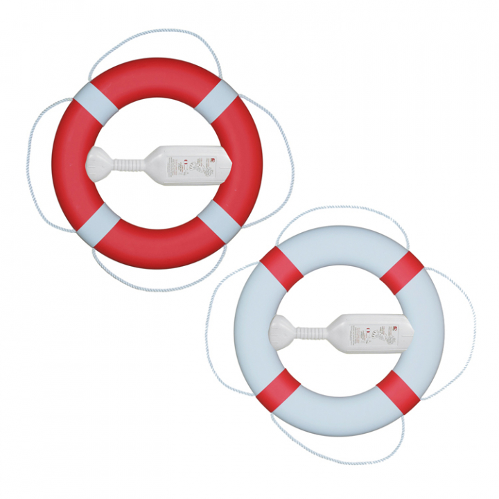 Vit livboj med röda manschetter eller Röd livboj med vita manschetter. Rätt kastvikt (2,1 kg) och rund form som gör den lätt att kasta. Dessa livbojar kommer med 20m kastlina.