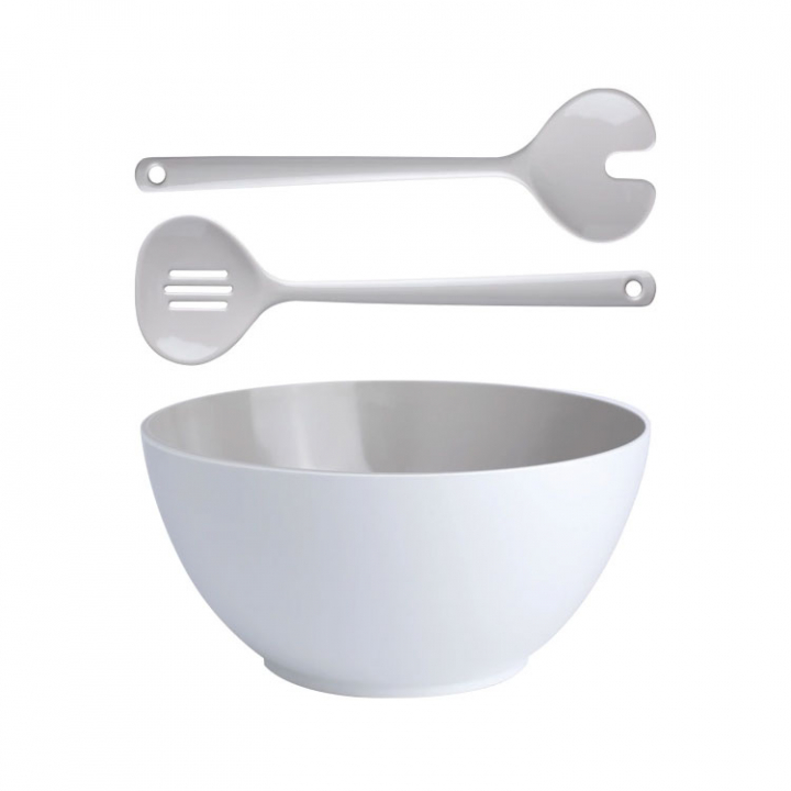 Det ser ut som porslin, men det är det inte! Salladsskål med salladsbestick av högkvalitativ melamin, extra tålig och nästan okrossbar. Kan diskas i diskmaskin.