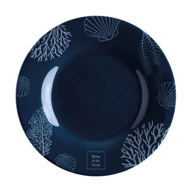 Melaminservis från Living-kollektionen är lätt och har en halkfri botten. Koralldesignen i marinblått och beige är elegant och modern, perfekt för alla tillfällen.