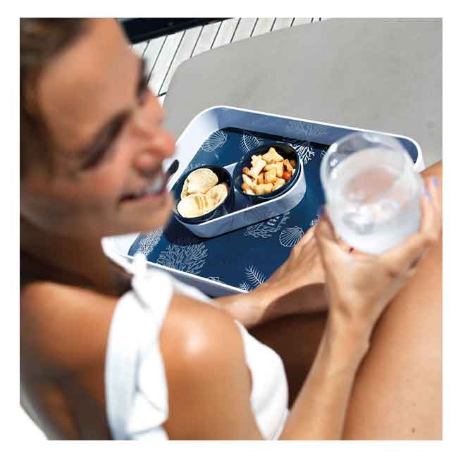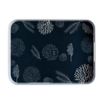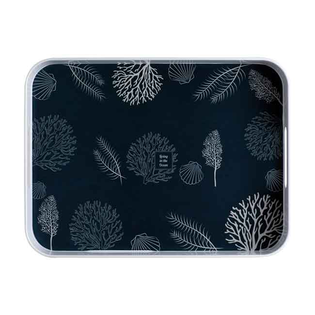 Bricka med 2 handtag från Living-kollektionen är lätt och har en halkfri botten och höga sidor så att ingenting glider av brickan. Koralldesignen i marinblått och beige är elegant och modern, perfekt för alla tillfällen.