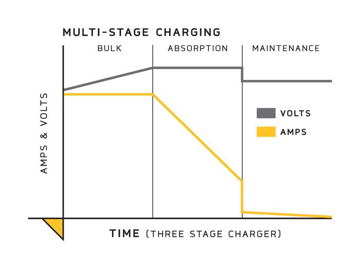 MK330E har ett trestegs laddningsförlopp, huvud-, utjämning- och underhållsladdning. Batteriet blir skonsamt laddat och kan underhållsladdas i månader. Laddningsspänningen är temperaturkompenserad för bästa möjliga laddning oberoende av omgivningstemperatur. När det är kallt behöver laddningsspänningen ökas för att batteriet skall ta emot laddning och bli fulladdat. På samma sätt fungerar det när det är varmt, spänningen måste sänkas för att förhindra att batteriet blir överladdat. - Egenskaper