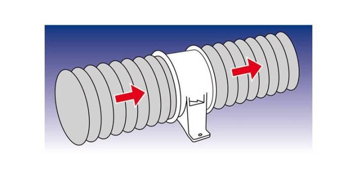 Motorrumsfläkt för slang – slang montering i "in-line" utförande med ett flöde på 3,9 m³/min. Används lämpligen vid enklare montage där systemet har korta slangar och få krökar.